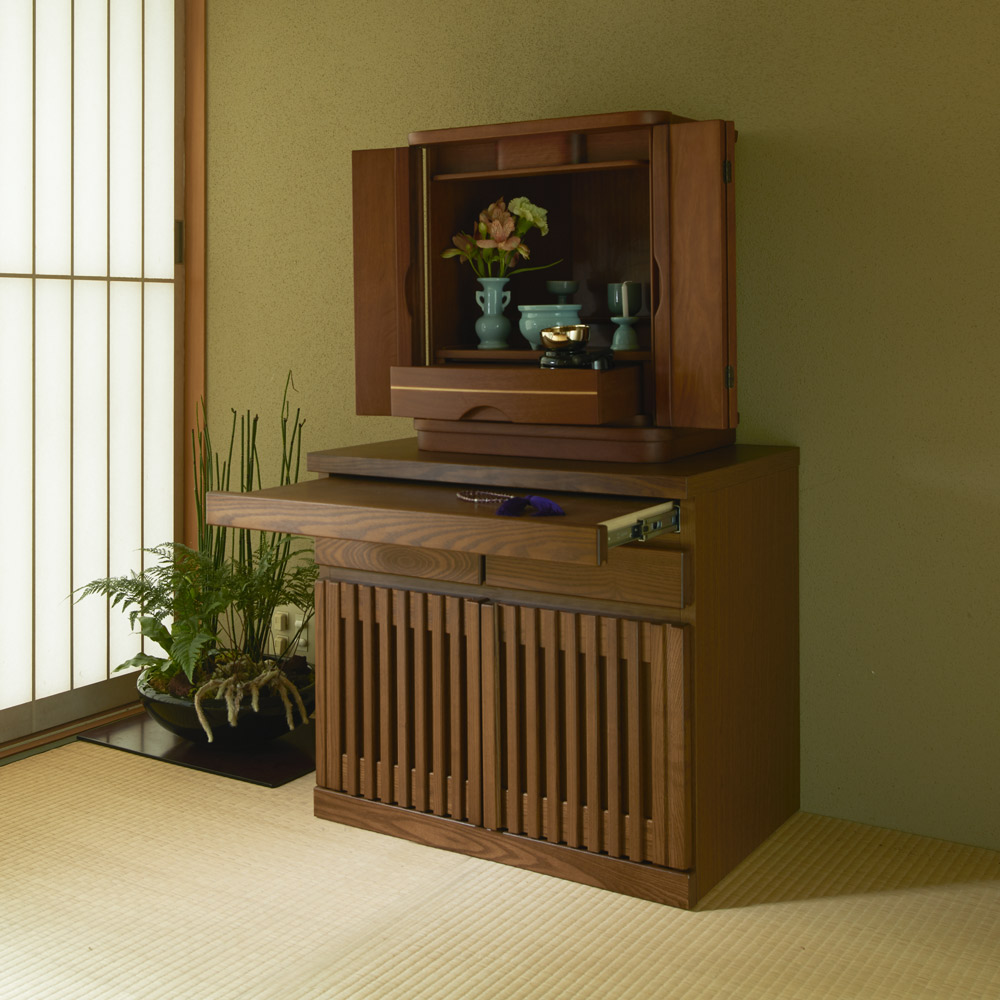 天然木の格子デザインが美しい国産の仏壇下台。凛とした佇まいは和室にも洋室にもなじみ、現代のインテリアに合わせたお仏壇スタイルが完成します。