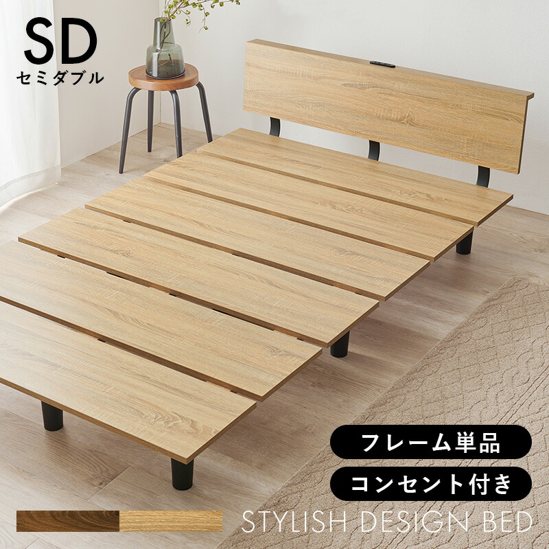 セミダブルベッド ベッド フレーム 木製 木目パネル 黒い脚 ロースタイル コンセント付き スタイリッシュ おしゃれ 北欧 床下収納 通気性 シンプル 一人暮らし
