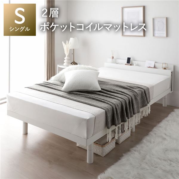 ■シングルベッド 白 ホワイト ベッド 2層ポケットコイルマットレス付 白 ホワイト 宮付き 高さ調整 すのこ ベット シングルベッド 白 ホ