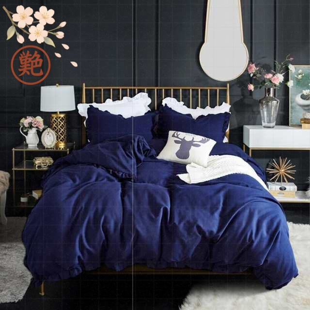 ■北欧 和風 和室 布団カバー おしゃれ ネイビー 4点セット 肌に優しい 無地 ダブル 掛け布団カバー 紺 春夏秋冬 寝具カバーセット フリル