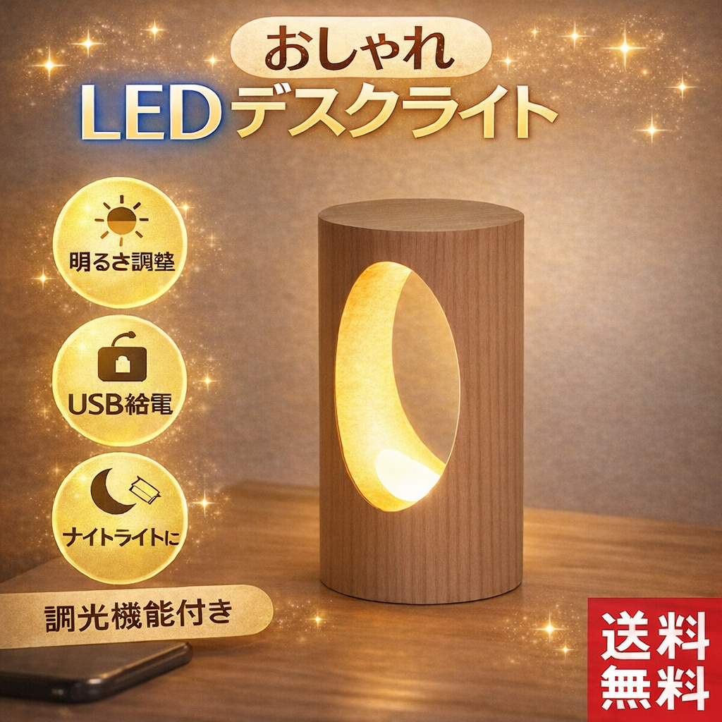 ■デスクライト LED 北欧 円形 USB充電 ミニ 調光 コンパクト テーブルランプ おしゃれ シェード 間接照明 スタンド 寝室 リビング 卓上 木