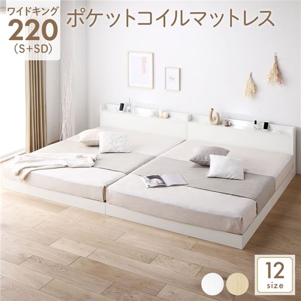 ■ベッド 低床 連結 ロータイプ すのこ 木製 LED照明付き 宮付き 棚付き コンセント付き シンプル モダン ホワイト ワイドキング220(S+SD