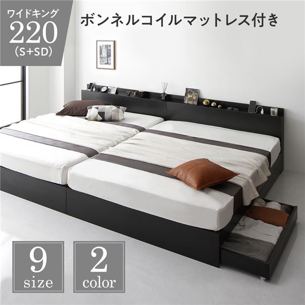 ■ベッド 収納付き 連結 引き出し付き キャスター付き 木製 棚付き 宮付き コンセント付き シンプル モダン ブラック ワイドキング220(S+S