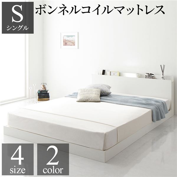 ■ベッド 低床 ロータイプ すのこ 木製 LED照明付き 棚付き 宮付き コンセント付き シンプル モダン ホワイト シングル ボンネルコイルマッ