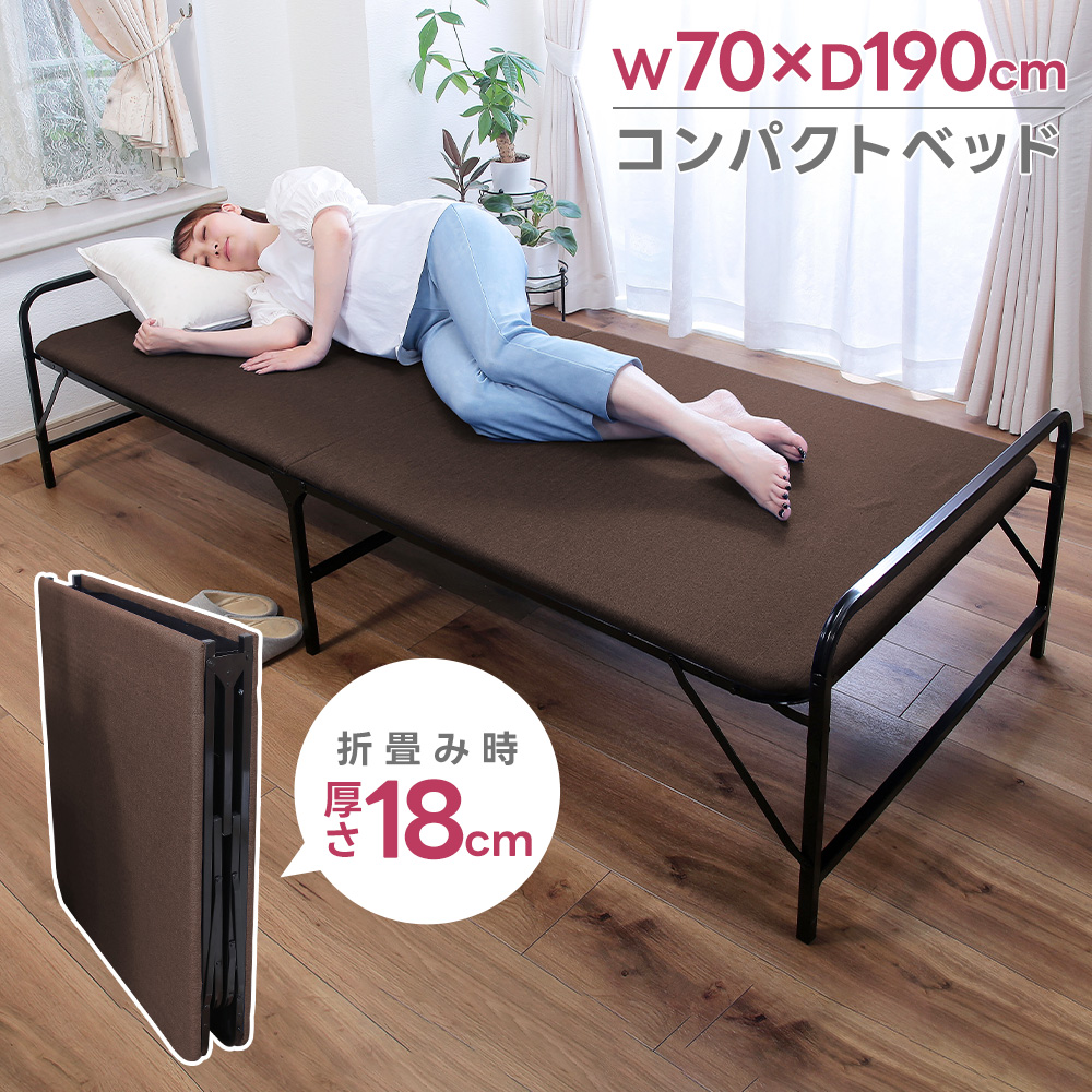 ■商品仕様■商品名:折りたたみシンプルベッドサイズ(cm):使用時/W70×D190×H47 収納時/W70×D18×H92重量:16kg耐荷重:90kgカラー:ブラウン材質:構造部/金属(鋼)、表面加工/粉体塗装 張地/ポリエステル、中材/ウレタンフォーム 脚部キャップ/PVC組立:完成品検索ワード:ベッド bed 布団 折り畳み 折りたたみ 収納できる 簡易 コンパクト スリム 一人暮らし 新生活 省スペース 来客用 完成品 簡易ベッド 寝具 シンプル 予備
