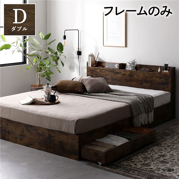 ■ベッド 収納付き 引き出し付き 木製 棚付き 宮付き コンセント付き シンプル モダン ヴィンテージブラウン ダブル ベッドフレームのみ 【