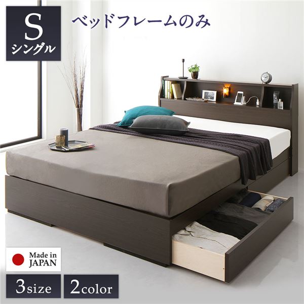 ■ベッド 日本製 収納付き 引き出し付き 木製 照明付き 棚付き 宮付き コンセント付き シンプル モダン ブラウン シングル ベッドフレーム