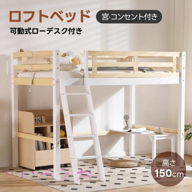 木製ベッド ロフトベッド シングルベッド 二段ベッド ミドルタイプ 天然木 可動式 ローデスク付き コンセント・宮付き 子供ベッド 北欧風 子供部屋 大人 一人暮らし