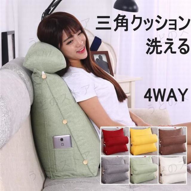 ■商品名■三角クッション■商品説明■スマホや読書中の肘置きにしたり座椅子など使い方自由自在なソファクッション。枕は取外し可能で使用方法にあわせて三段階の調整が出来て便利。カバーは洗濯可能なので清潔にご使用いただけます。■製品仕様■bigサイズ:60x50x20cmsmallサイズ:45x45x20cm素材:カバー(コットン) 中身(ポリエステル)用途:4WAY(枕、背もたれ、うつ伏せクッション、仰向けクッション)■注意事項■※圧縮された状態でのお届けとなります。開封後はパンパンと叩き、細かく揉み込んでご使用ください。※海外製品のため日本の製品に比べて縫製や裏の始末が甘い場合がございます。※画像は、ご覧になっているモニターやPCなどの環境により、実物と多少カラーが異なる場合がございます。色味やサイズが異なるなどのクレームはご対応致しかねますので、ご了承ください。海外インポート品なので,国産商品より細かいところが不完璧の場合がございますが。商品の使用には問題がございません。上記の点で返品?交換の理由になりませんので,ご理解の上ご購入ください。