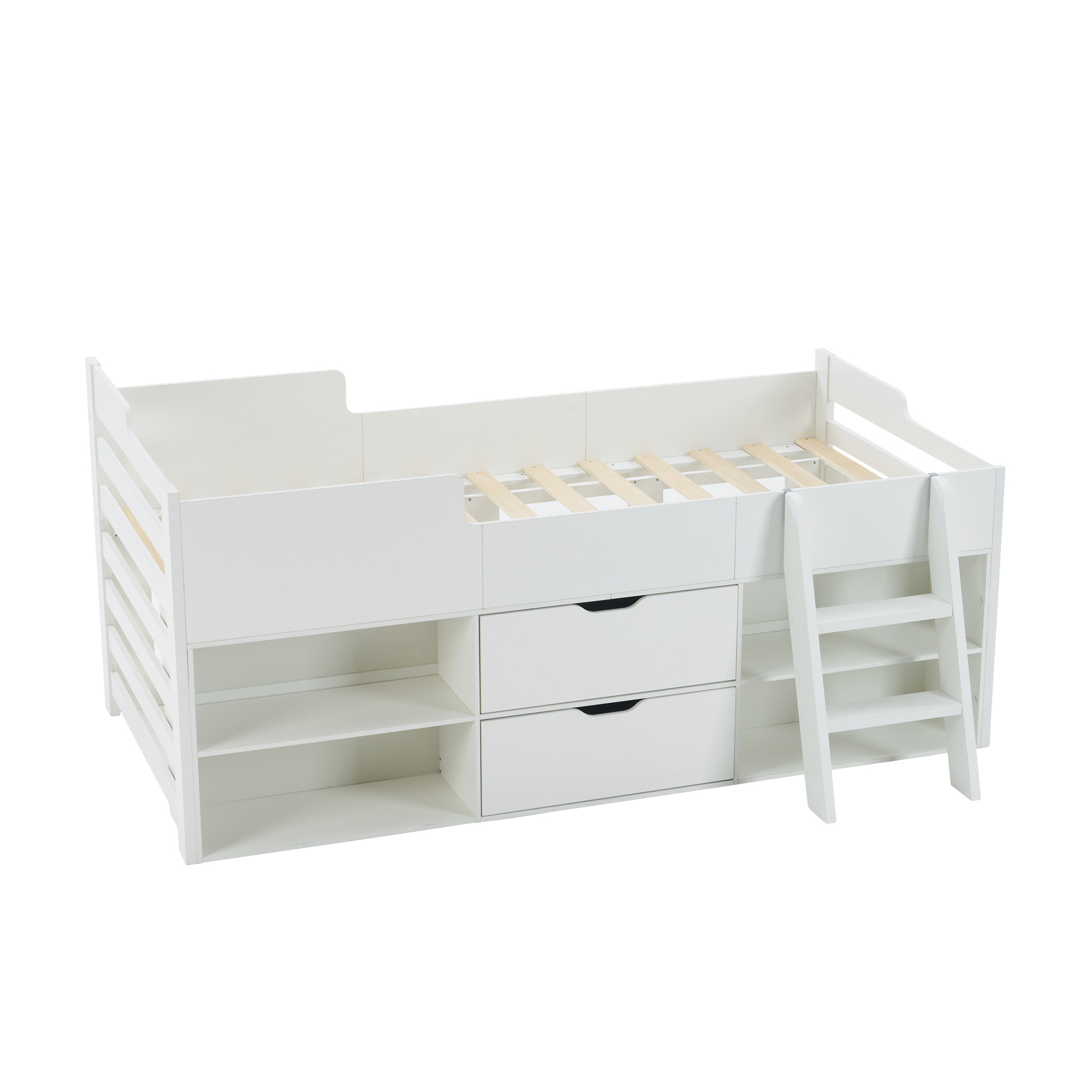 【モダン & シンプル】シンプルなホワイトデザインが、北欧・モダン・クラシックなどあらゆるインテリアにも自然に溶け込みます。【通気性の高いベッドボード 湿気対策も万全】ベッドボードの間隔はちょうどうの広さで、通気性が良いため、夏でも湿気やカピの心配がありません。一人暮らしで狭い部屋でも、床が広くて、睡眠質量を保証!*こちらの商品にはマットは付属していません。*マットのおすすめサイズ 写真のシングルベッドは「幅195CMx丈97CM」のマットを使用しています。マットをご希望の場合は、こちらのサイズを参考にご購入ください。【安全で安定した設計】ベッドの後ろに追加三本の補強支柱は支えているので、安定感があります。しっかりとした木製フレームで安定性が高く、安全をしっかり守ります。また、頑丈な木材を使って、揺れにくい構造なので、ベッド面の耐荷重は150kg。【四方フェンス】安心感満点ベッド四方にガードを設置、睡眠中の落下を完全防止、夜間も安心して眠れる適度な高さ設計で、出入りもスムーズ。全ての角を面取りすることで、使用時の思わぬケガのリスクも抑えられる安全なデザインとなっています。【ハシゴ】毎日上