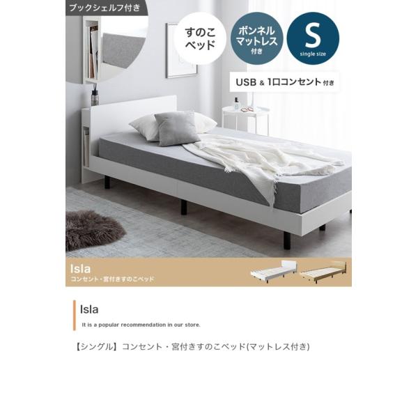 ■ベッド シングル ボンネルコイルマットレス付きセット 脚付き すのこ 宮棚付き コンセント付き 収納 木製 北欧 おしゃれ Isla ID003