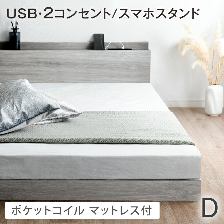 ベッド マットレス付き ダブル USB・2コンセント & スマホスタンド付 フレーム 宮棚付き すのこベット ローベット ダブルサイズ ベット 宮付きベッド ダブルベッド おしゃれ 北欧 低い【商品番号:73400077】