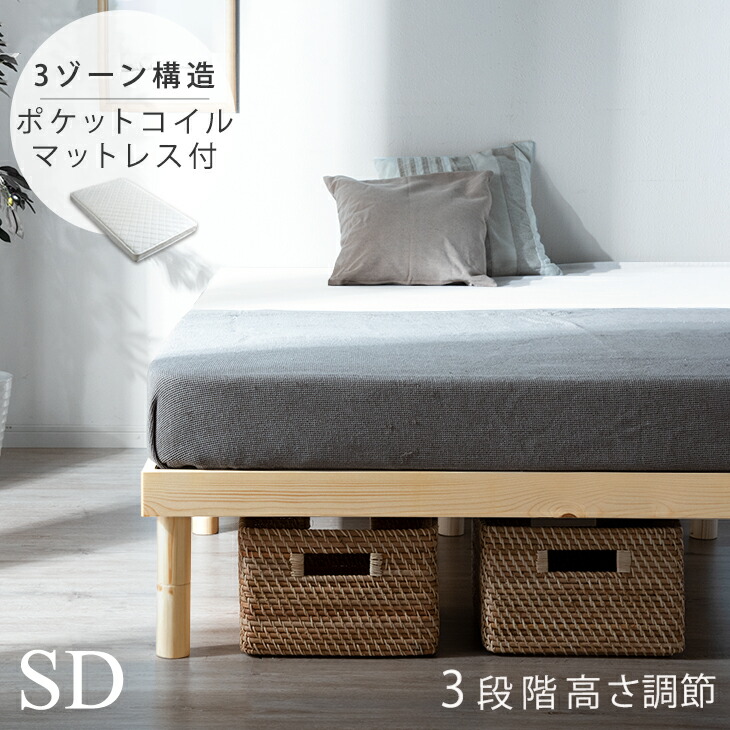 ■【26日9:59迄!P5%還元】 ベッド マットレス付き 3段階高さ調節 天然木 すのこベッド セミダブルベッド 3ゾーン ポケットコイルマットレス