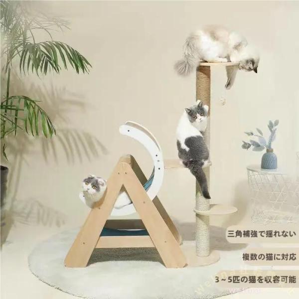 ??【猫が喜ぶ機能満載】:たくさんのおもちゃがあるね。見晴らしのよい高台、猫おもちゃ、爪とぎポール、遊び放題の幅広い台座、くつろげる猫ベッドなどを取り付きました。猫ちゃんの遊び場としてピッタリの室内用キャットランドです。 ??【高品質素材】:このキャットタワーは天然サイザル麻と天然木を選用、太くて壊れにくい麻紐に製作して、思う存分ガリガリしても爪を傷けず、猫ちゃんの成長と共に長持ちできるな。力学的原理に基づいた安定なデザインは、大きな猫ちゃんが遊んでも揺れにくいです。 ??【頑丈で安定したデザイン】:キャットベッドを三角形に補強することで、キャットタワーがぐらつかず安定性が増します。下の台座はしっかりと上部の重さと猫ちゃんの重さを支え、猫ちゃんが上り降りでも揺れない、飼い主さんも猫ちゃんも安心で使用いただけます。 ??【設置自由 省スペース】:スペースを取らないので、ワンルームの方でも安心できます!据置タイプは部屋の角、ソファーの横など、どこでも自由に設置可能!圧迫感もなく、いつでも猫ちゃんと遊べます。 ??【多用途】:子猫、大型猫、老猫に適しています。遊び、爪