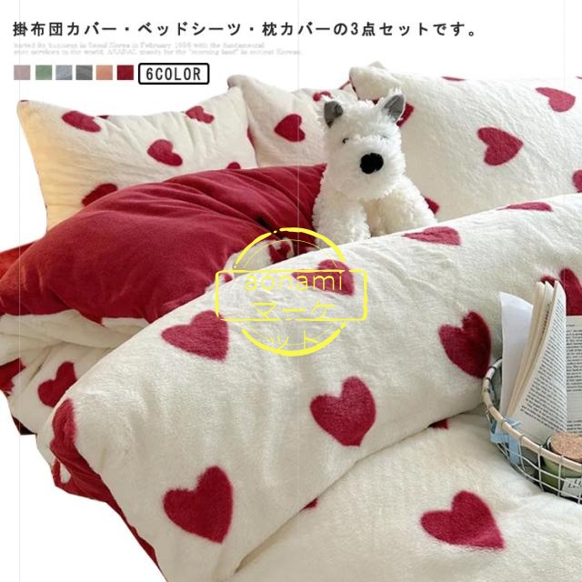 秋冬 ベッドシーツ 防寒対策 ふわふわ 冬用 敷き布団カバー 掛けカバー フェイクファー 寝具カバー 枕カバー カジュアル 布団カバーセット 厚手 暖かい フラットシーツ ハート柄 洗える シングル かわいい 送料無料 3点セット 掛け布団カバー