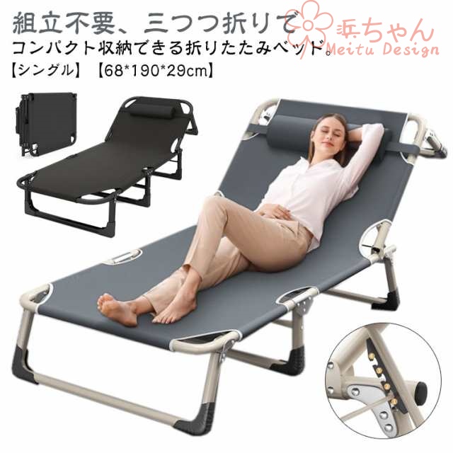 折りたたみベッド 組立不要 68×190cm 折りたたみ ベッド シングル ワイド 三つつ折り 完成品 簡易 ベッド リクライニング コンパクト 収納 スチール パイプベッド 頑丈 軽量 通気性 スリム 省スペース 来客用 アウトドア 庭 キャンプ コット