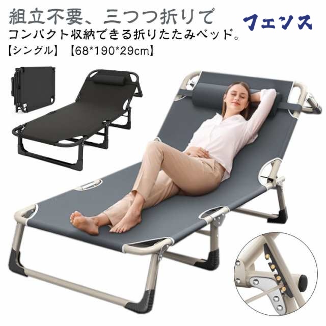 折りたたみベッド 組立不要 68×190cm 折りたたみ ベッド シングル ワイド 三つつ折り 完成品 簡易 ベッド リクライニング コンパクト 収納 スチール パイプベッド 頑丈 軽量 通気性 スリム 省スペース 来客用 アウトドア 庭 キャンプ コット