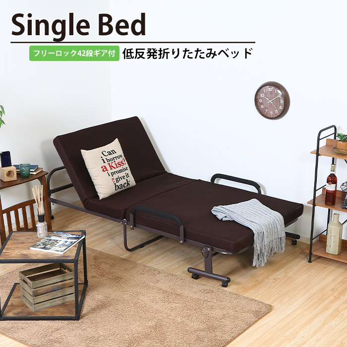 ■ベッド シングル 折りたたみ リクライニング 42段ギア 幅97 奥行208 高さ44 キャスター付き 低反発マットレス ベッド フリーロック