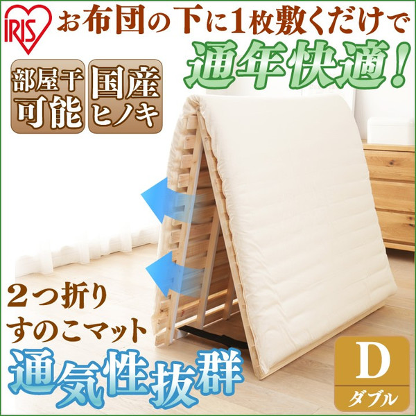 お使いのお布団の下に1枚敷くだけ。爽やか新鮮な風を通し、お布団をカビやダニから守り清潔に保ちます。【1.毎日のお布団干しができないお忙しい方に。】お使いのお布団の下に敷いて寝るだけで、爽やかな風を通し、お布団を清潔に保ちます。【2.折りたたんでお布団干し & コンパクト収納。】2つに折りたたんでバンドで固定すれば、ベッドが布団干しに早変わり。窓際に置いて天日干しが簡単にできるので、毎日でもお布団が干せます。折りたたんでコンパクト、女性でもラクラク持ち運びOK。【3.細部にもこだわってます。】すのこの角はしっかりと面取りをしてあるので、大事なお布団を引っかけたり傷つけることがなく安心です。※当商品はお取り寄せ品の為、在庫の確認及び商品のお届けまでお時間を頂く場合がございます。また、商品がメーカーにて完売となっていた場合、キャンセル又は注文内容の変更をお願いいたしております。予めご了承くださいますようお願いいたします。■こちらの商品はアイリスプラザがセレクトしたオススメ商品です。