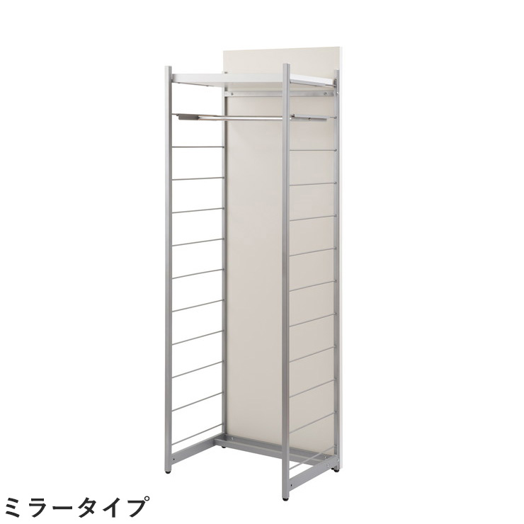 ■商品について/頑丈設計の間仕切りラックシリーズ。棚板厚のボリュームアップにより強度も備えた収納面に間仕切り面はすっきりとした木目調から清潔感あるホワイト色の3カラー展開。収納面はハンガーラックと4段棚の2タイプに、間仕切り面はボードと全身ミラーの2タイプをご用意。オフィスでの使用はもちろん、ご家庭でも間仕切りプラス収納で使い勝手のよいパーテーションです。ミラータイプはダンススタジオやヨガスタジオ、ダンスレッスンなどにも重宝。充実した収納&頑丈がポイント。■商品の仕様/フレーム:スチール(エポキシ粉体塗装)、棚板・ボード:プリント紙化粧繊維板、ハンガーバー:スチール(メッキ仕上げ)■商品サイズ/本体:(約)幅60×奥行47×高さ181cm、ラダー間隔:(約)14cm■棚板/可動式1枚(14cmピッチ12段)、ハンガーバー/1本(14cmピッチ可動)■耐荷重量/棚板:(約)20kg■商品重量/(約)30kg■日本製■組立品(組立時間:2名で約30分)