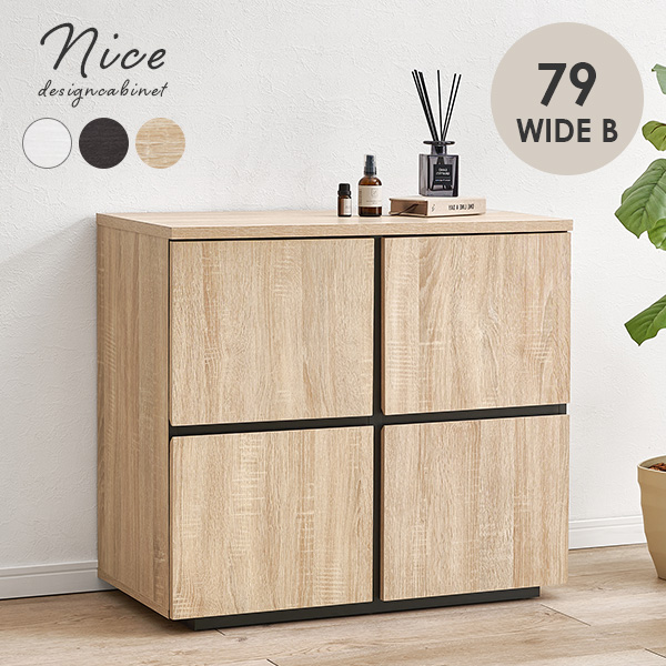 用途にあわせて幅広く使えるキャビネット「ナイス」衣類や本・雑誌、文房具や貴重品などさまざまなものの収納棚として使えます。扉収納は可動棚で高さの調節が可能。背の高いものを収納したい場合は、可動棚を外して収納することもできます。背面には安全面に配慮した揺れ防止具付きです。カラーバリエーションは3色展開。ブラックのアクセントで引き締まって見えるナチュラル、清潔感のあるホワイト、どんなお部屋にも合わせやすいダークブラウンから選べます。【商品サイズ(約)】幅79×奥行39×高さ71cm【梱包サイズ(約)】88×44.5×23cm(33.5kg)【材質】プリント紙化粧パーティクルボード【生産国】マレーシア【備考】組立品(プラスドライバー・ハンマーが必要)
