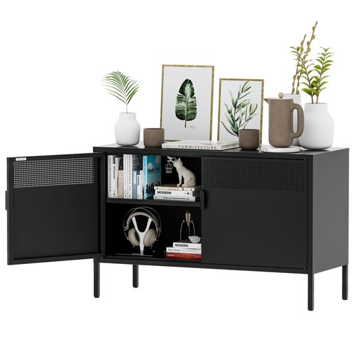 ■科飛亜 キャビネット 鋼製 サイドボード 扉付き リビング 収納 棚 観音開き 調節可能な棚付き 通気孔付き おしゃれ リビングルーム、ダイ