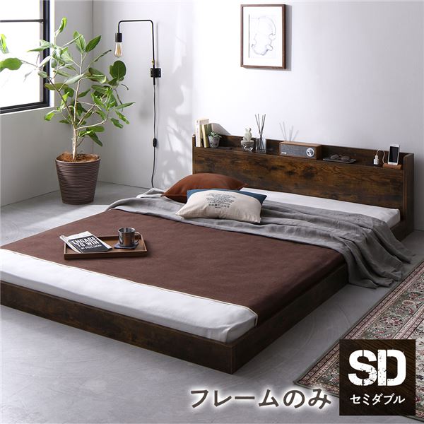 ■ベッド セミダブル ベッドフレームのみ ヴィンテージブラウン 低床 宮付き 棚付き 宮棚付き コンセント付き すのこ フロアベッド ローベ