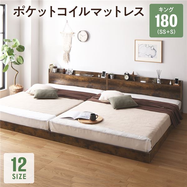 ■ベッド キング 180(SS+S) ポケットコイルマットレス付き ヴィンテージブラウン 連結 低床 すのこ LED 照明付き 宮付き 棚付き 宮棚付き 2