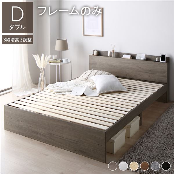■ベッド ダブル ベッドフレームのみ グレージュ 高さ調整可 棚付き 宮付き コンセント付き すのこ 【北海道・沖縄・離島配送不可】
