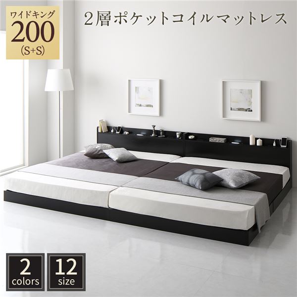 ■ベッド ワイドキング200(S+S) 2層ポケットコイルマットレス付き ブラック 低床 連結 すのこ LED 照明付き 宮付き 棚付き 宮棚付き 2口
