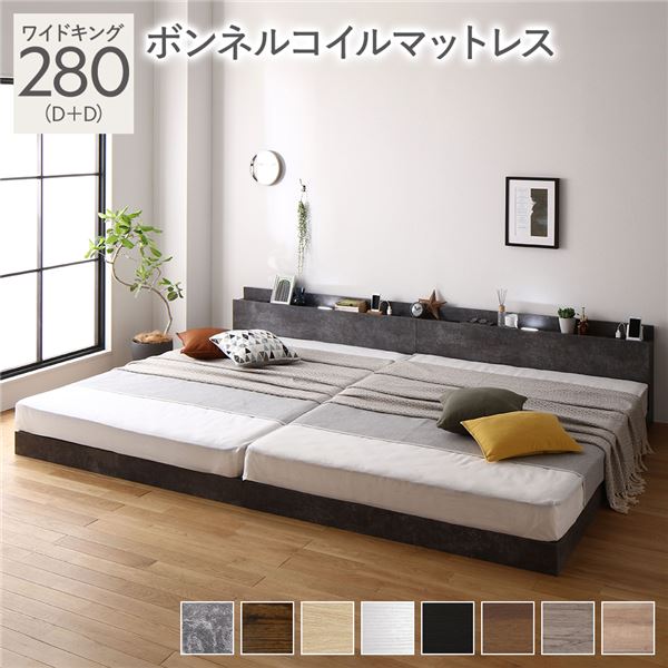 ■ベッド ワイドキング 280(D+D) ボンネルコイルマットレス付き ストーングレー 低床 連結 すのこ LED 照明付き 宮付き 棚付き 宮棚付き 2