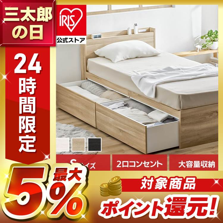 「収納量」にこだわりをもった、引き出し付の大容量収納ベッド。ワンルームなどで収納スペースがあまりない方や、お部屋をスッキリ見せたい方にもおすすめ。引き出しはキャスター付きでスムーズに開閉できます。引き出し側でないフリースペースはスーツケースや布団など、季節ものの収納に使えます。ヘッドボードには2口コンセント付。携帯等の充電に便利です。棚スペースには目覚まし時計等の小物を置くことができます。通気性に優れたすのこ構造で、湿気を逃がします。★お客様組立★●商品サイズ(cm)幅約97.2×奥行約210.3×高さ約80●商品重量約62.75kg●耐荷重ヘッドボード天板:約5kg、本体:約100kg、引出:約10kg(1個あたり)、全体:約125kg●主要材質プリント紙化粧パーティクルボード、プリント紙化粧繊維板●電源コード仕様定格電圧:AC100V定格周波数:50Hz消費電力合計:1500Wまで※2人以上での組み立てをおすすめします。※耐荷重は測定値であり、保証値ではありません。(アイリスオーヤマ)