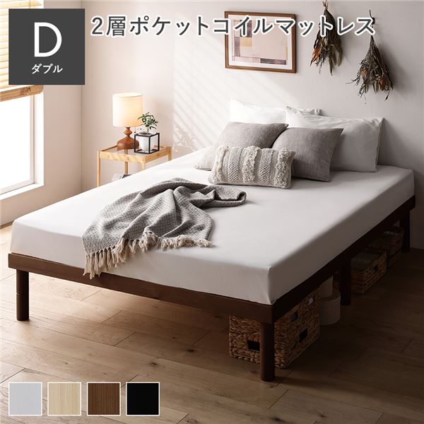 ■ダブルベッド 茶色 ブラウン 茶 天然木 すのこ ベッド 2層ポケットコイルマットレス付 茶色 ブラウン 茶 ヘッドレス 高さ調整 送料無料