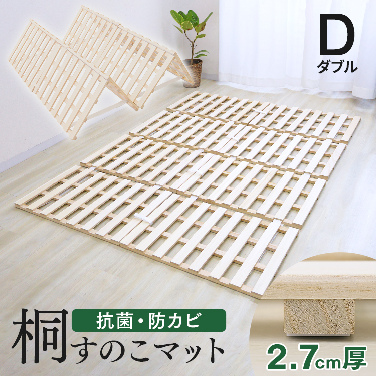 ■ダブルベッド 4つ折り 桐 すのこ ベッド 3つ折りポケットコイルマットレス付 約幅140cm 天然木 軽量 連結可 折りたたみ 送料無料