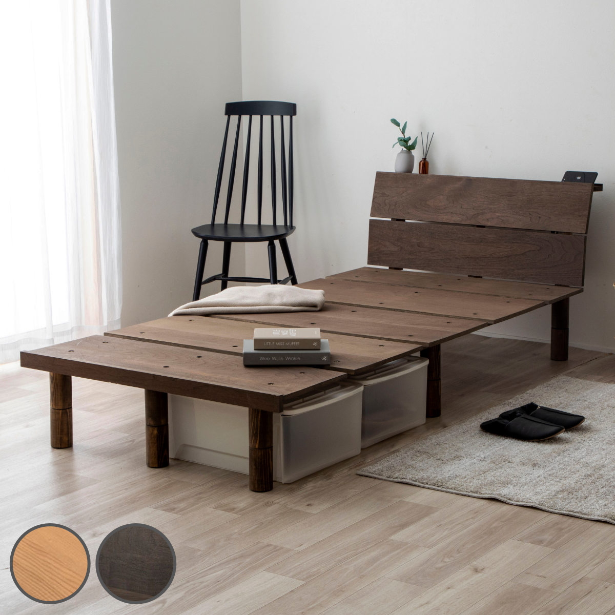 機能的なヘッドボード スリム棚&2口コンセント 天然木すのこ仕様 風通しも良くいつも清潔に。 レッグタイプだからお掃除もラクラク。 布団派の方にも最適敷布団でも使えます。 *スタンダードボンネルコイルマットレス付き