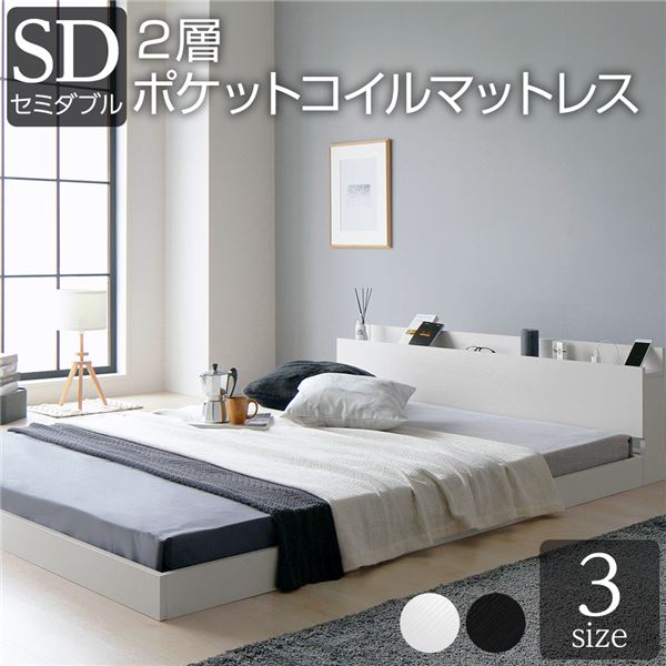 ■ベッド セミダブル 2層ポケットコイルマットレス付き ホワイト 低床 すのこ 棚付き 宮付き 宮棚付き 2口 コンセント付き ローベッド フロ