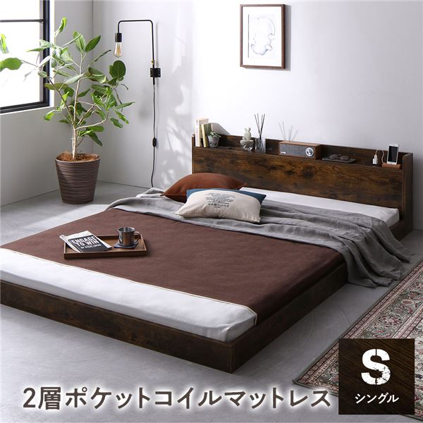 ■ベッド シングル 2層ポケットコイルマットレス付き ヴィンテージブラウン 低床 棚付き 宮付き 宮棚付き コンセント付き すのこ フロアベ