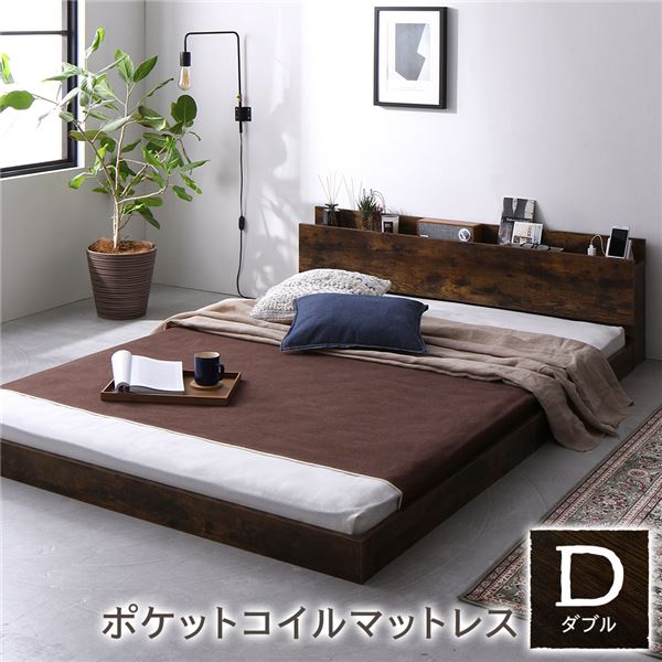 ■ベッド ダブル ポケットコイルマットレス付き ヴィンテージブラウン 低床 すのこ 宮付き 棚付き 宮棚付き 2口 コンセント付き ローベッド