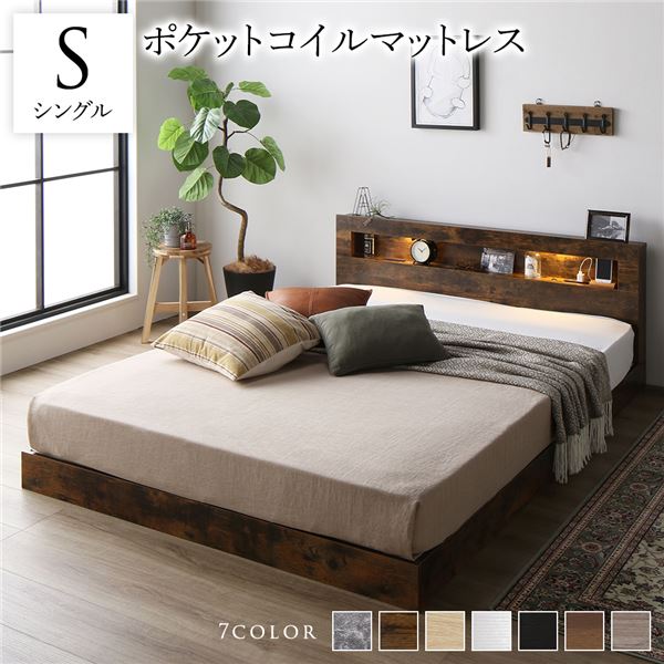 ■ベッド シングル ポケットコイルマットレス付き ヴィンテージブラウン 低床 すのこ LED 照明付き 宮付き 棚付き 宮棚付き 2口 コンセント