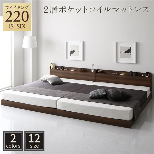 ■ベッド ワイドキング220(S+SD) 2層ポケットコイルマットレス付き ブラウン 低床 連結 すのこ LED 照明付き 宮付き 棚付き 宮棚付き 2口