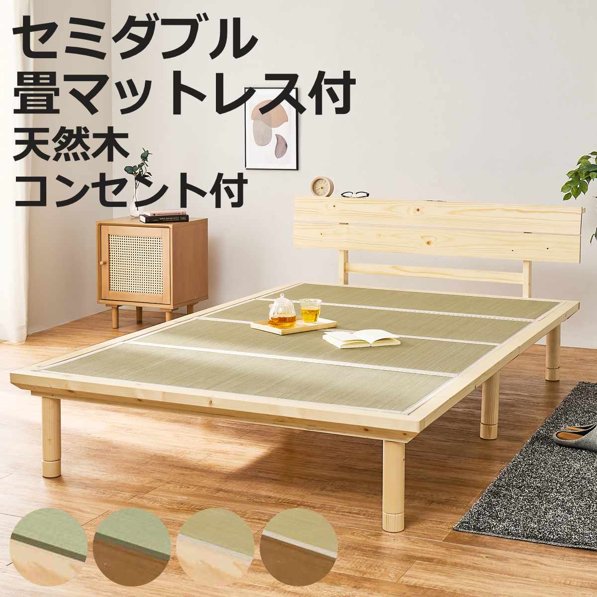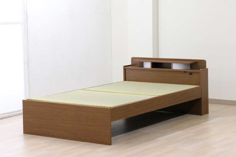 ■畳ベッド セミダブル 天然い草 宮棚 2口コンセント付 耐荷重300kg ( ベッド 畳 棚付 たたみ い草 コンセント付 和モダン ライトブラウン