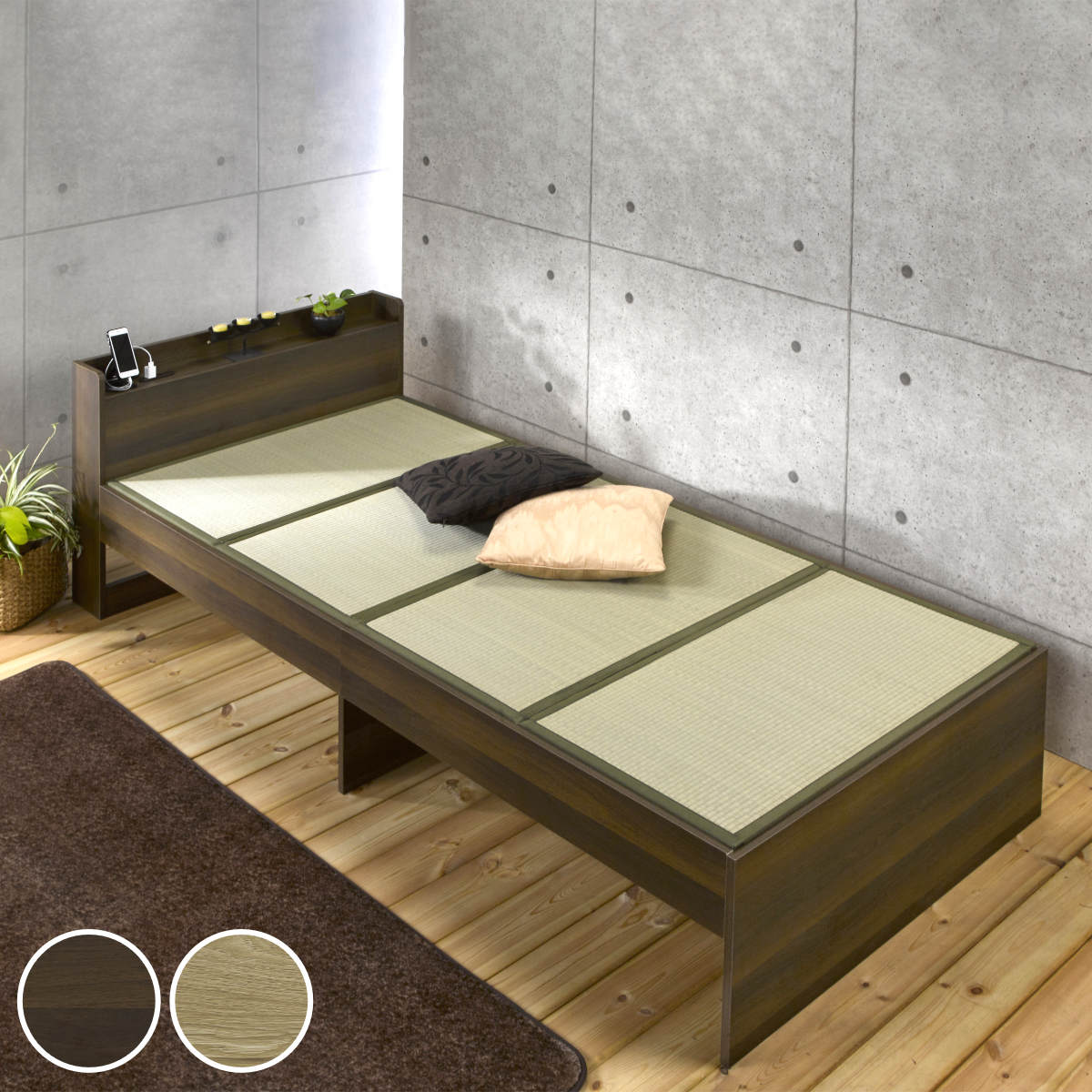 ■畳ベッド シングル 宮棚 2口コンセント付 ( ベッドフレーム 畳 ベッド 棚付 天然い草 たたみ 抗菌 調湿 消臭 畳マットレス 畳付 コンセ