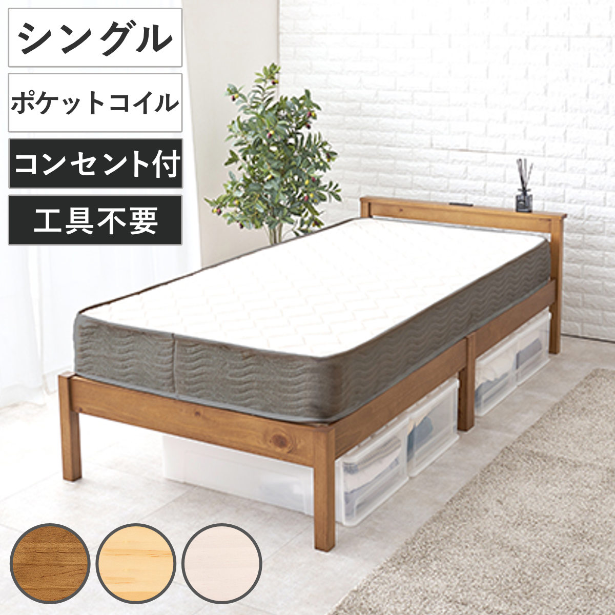 ■3分組立ベッド シングル ポケットコイルマットレス付 宮棚 2口コンセント付 工具不要 天然木 ( ベッド 3分組み立て 組み立て簡単 棚付き
