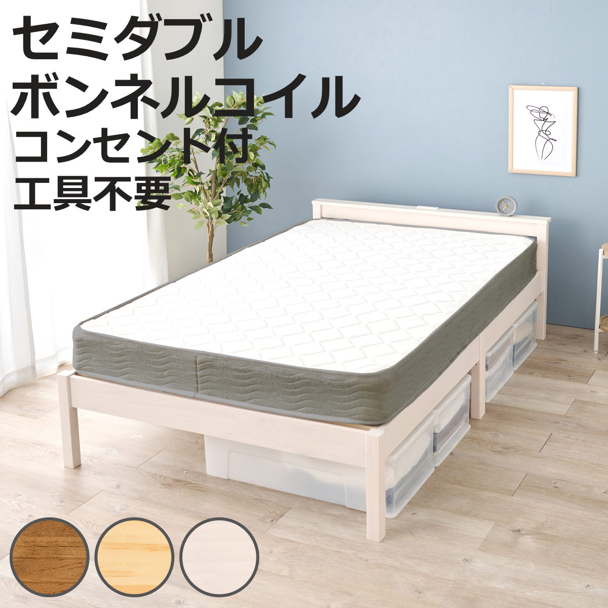■3分組立ベッド セミダブル ボンネルコイルマットレス付 宮棚 2口コンセント付 工具不要 天然木 ( ベッド 3分組み立て 組み立て簡単 棚付