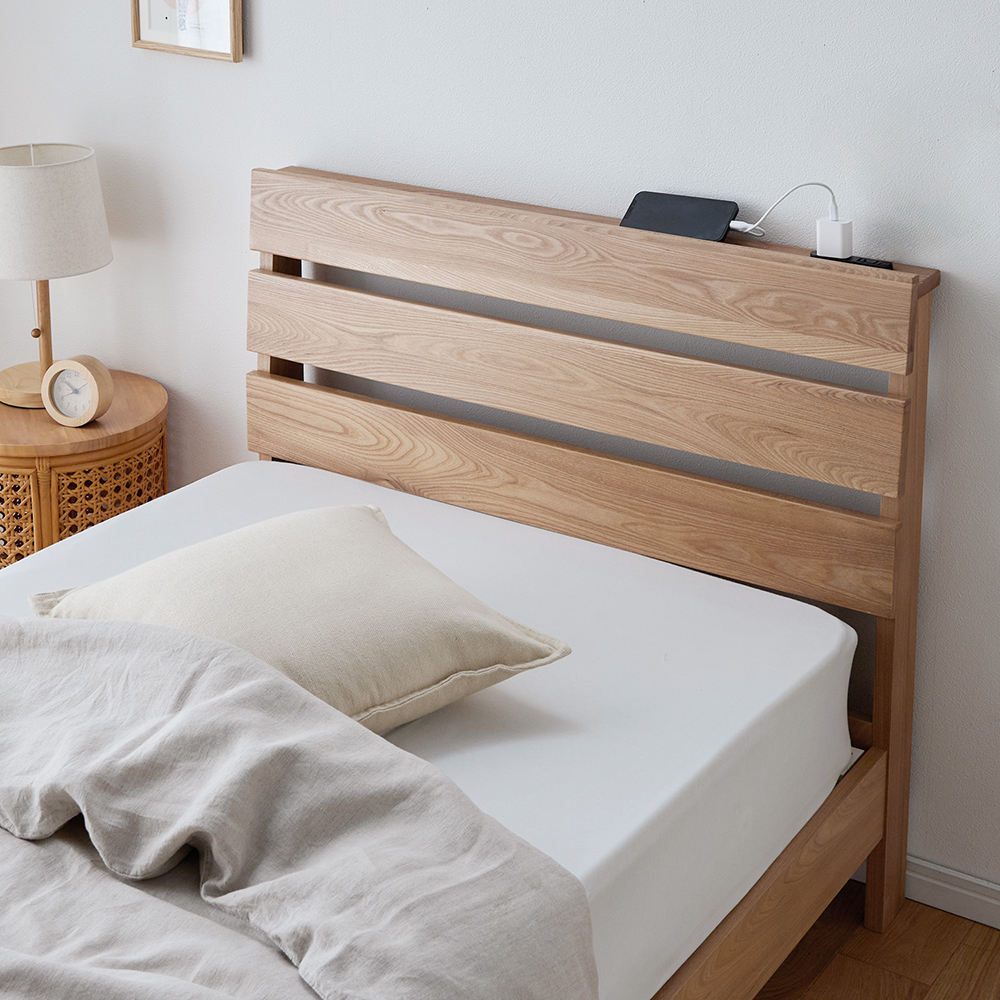 天然木ニレ材を贅沢に使用した柔らかい風合いのベッドフレーム天然木ニレの無垢材を使用したヘッドボードには、携帯やメガネが置ける便利な小棚付き2口のコンセントにはホコリの入り込みを防ぐスライドカバー付き床板は積層合板をすのこに用い、強度と通気性にこだわりました床板をサイドフレームにボルトで連結することにより、丈夫でより長持ちするように設計していますサイズの大きなセミダブル・ダブルサイズは6本脚仕様で床板をしっかりと支えます。#ベッドフレーム