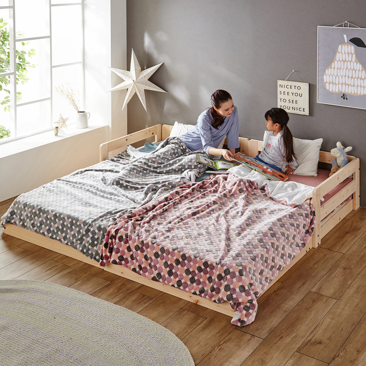 香りを楽しめる天然木ひのき材の親子ベッドローベッドなので小さなお子様やご年配の方にも安心ですすのこ仕様なので通気性も良く、オールシーズン寝心地は快適L字に組めるヘッドボード部は、左右で付け替え可能サイドガードがついているから布団が落ちにくいのもうれしいポイント ベッドを複数購入すれば連結させることができ、親子並んでおやすみになれます取り付け金具付きだから連結してもズレる心配がなく安心です国内工場で製造した日本製商品です