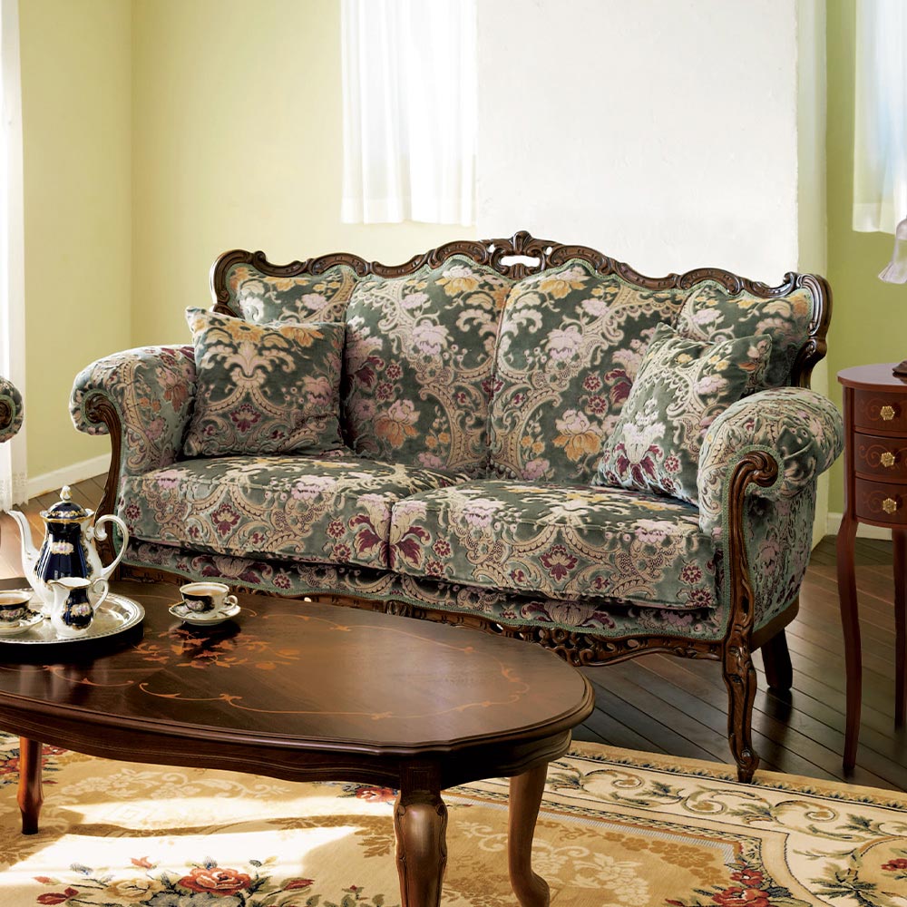 金華山織りのしっとりした手触りと愛らしい猫脚、クラシックな彫刻に象徴されるヨーロッパデザインが魅力の華やかなソファー。ふっくらとしたボリュームと立体感のあるイタリアンファブリックの豊かな表情で、お部屋に高級感を添える人気のイタリア家具シリーズです。置くだけでお部屋の主役になる美しさで、リビングルームやゲストルーム、寝室にもおすすめの2人掛けチェアです。