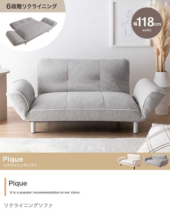 ころんとしたフォルムとパイピング加工が可愛い『Pique(ピケ)』リクライニングソファ。6段階でリクライニングする背もたれとアームレストはお好みの角度で調節ができ、自分だけのくつろぎ空間が作り出せます。バイカラーのパイピングはソファの柔らかな可愛さを引き出し、置くだけでお部屋のアクセントに。また、お部屋に圧迫感を与えないロー設計のため、1人暮らしやワンルームの方にもおすすめです。