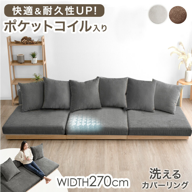 ■快適&高耐久 ポケットコイル フロアソファ ワイド 幅270cm 洗える カバーリング 4人掛け 3人掛け ソファ ソファー ローソファ ローソフ