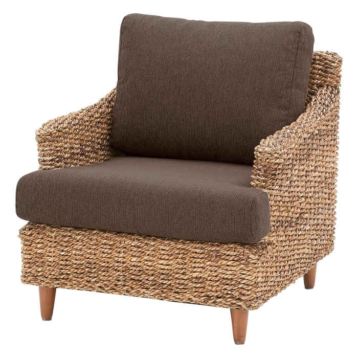 毎日の生活をバリ島のエスニックな癒やしのアジアンリゾート空間に。アジアン家具のウォーターヒヤシンス製の1人掛けソファです。奥行きがあり深く腰を下ろす事ができるので、ずっと座っていたくなるような心地よさ。センターテーブルやTVボードなど、他のアジアン家具と合わせてお部屋をアジアンスタイルにトータルコーディネイト。水草(ウォーターヒヤシンス)を職人が一点一点丁寧に編み込んでいます。ウォーターヒヤシンスは繁殖性が高く、環境にも優しいエコな素材。独特の温かみあるアジアンテイストな雰囲気は根強い人気があります。 クッションカバーはお部屋のイメージやテイストに合わせて、6色の中からお選び下さい。本体:NK(ナチュラル)クッション:6色からチョイス(ベージュ、ライトブラウン、ダークブラウン、オレンジ、パープル、グリーン )外寸:(幅)68×(奥行)77×(高)65 (座面高)35 cm 下空間高さ:8 cm、肘掛け高さ:48 cm